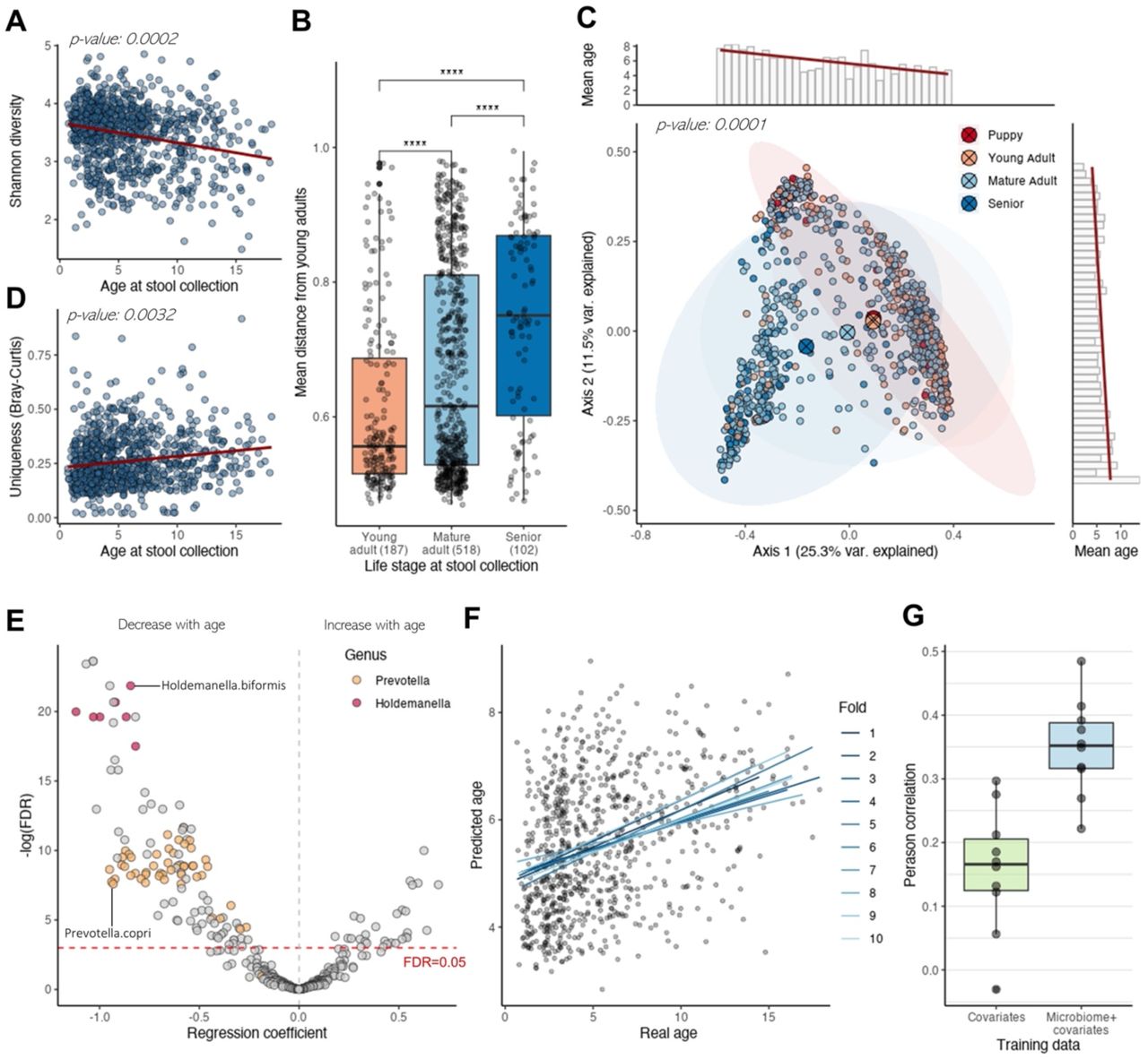 Companion dogs (Canis lupus familiaris) offer a unique model for studying the gut microbiome and its relation to aging due to their cohabitation with humans, sharing similar environments, diets, and healthcare practices. Here, we present the Dog Aging Project (DAP) Precision cohort, the largest population-wide study of the canine gut microbiome to date. This cohort encompasses over 900 dogs of diverse breeds, environments, and demographics living across the United States. Coupling fecal shotgun metagenomic sequencing with comprehensive phenotypic and environmental surveys and clinical lab tests, we explore the intricate relationships between microbiome composition, aging, and key factors such as diet, health, and living conditions. Our analyses identify various factors associated with microbiome composition. In addition, we find a gradual shift in microbiome composition with age, which allows us to develop a novel metagenomics-based “clock” to predict biological aging based on microbial signatures. Overall, these findings provide an unprecedented and detailed understanding of the role the gut microbiome plays in our four-legged companions, offering both potential applications in veterinary medicine and an exciting model for aging research.